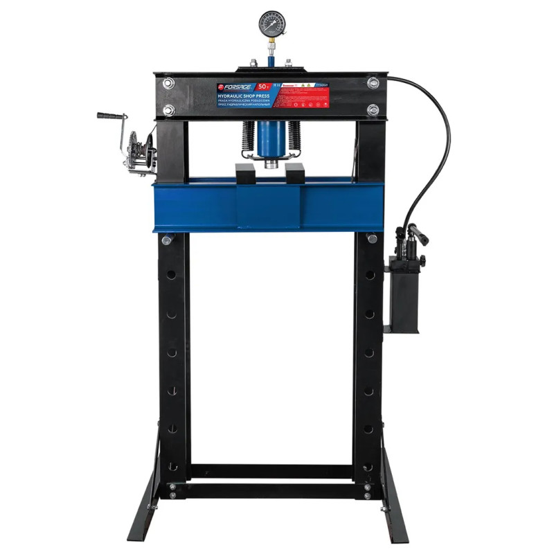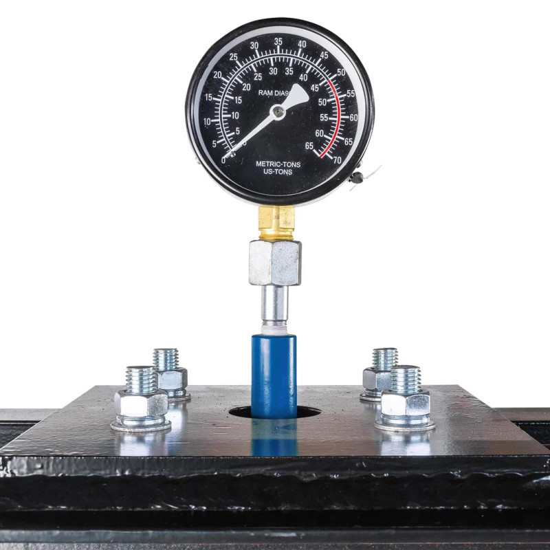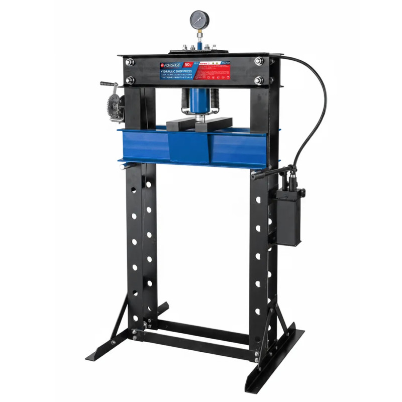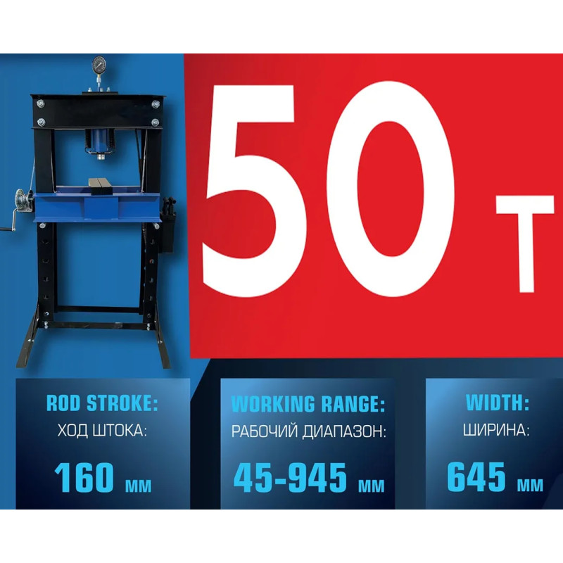 Пресс также оснащён манометром, служащим для контролирования давления. Максимальная нагрузка 50т Рабочая высота 0-920мм Рабочая ширина 730мм Рабочий стол 240х730мм Ход штока 200мм Вес 373кг.