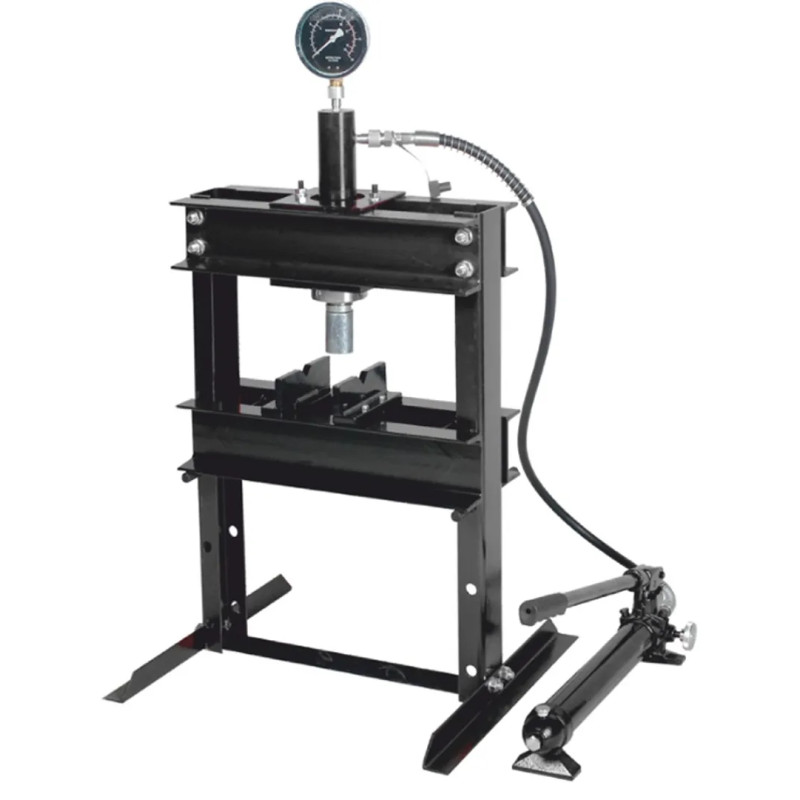 Пресс также оснащён манометром, служащим для контролирования давления. Максимальная нагрузка 12т Рабочая высота 0-340мм Рабочая ширина 400мм Рабочий стол 185х400мм Ход штока 175мм Вес 65кг.