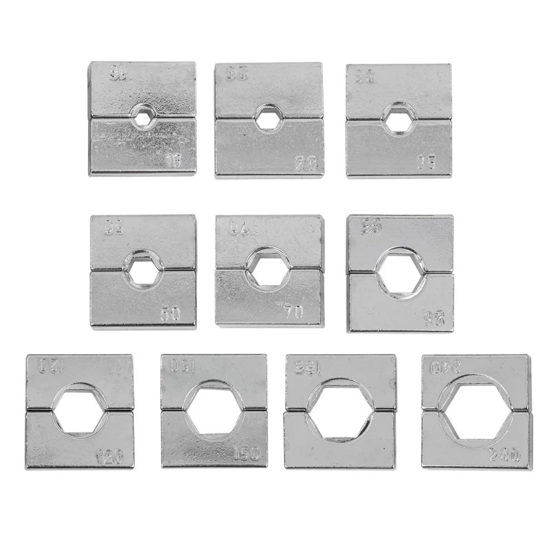В данном случае адаптеры представлены в размерах 16, 25, 35, 50, 70, 95, 120, 150, 185, 240 мм², что позволяет настроить клещи на нужный размер кабеля и обеспечить надежную и качественную обжимку.