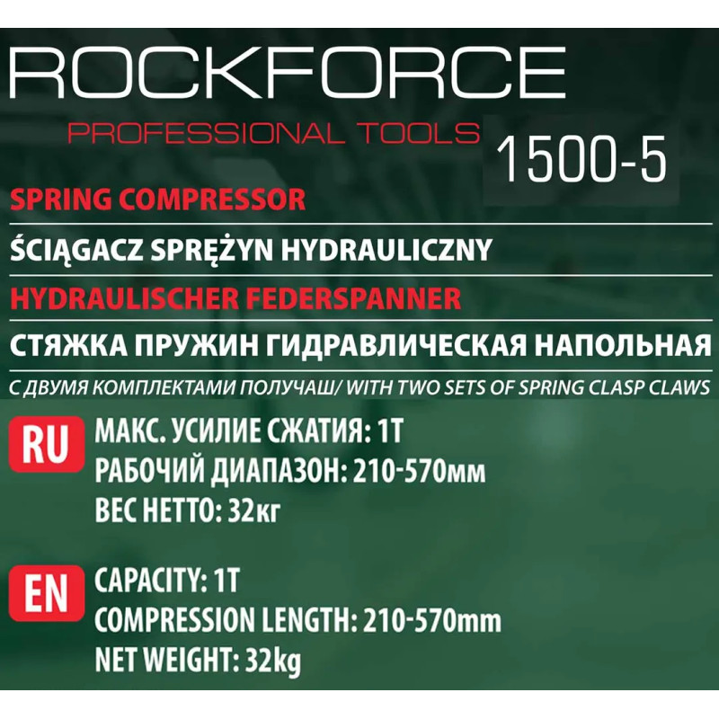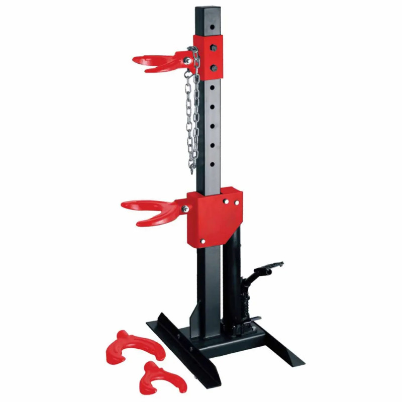 Съемник(стяжка) используется для замены пружин/амортизаторов типа McPherson вне автомобиля. Съемник изготовлен из массивных профилей. Пружина сжимается гидравлическим поршнем (ножной привод). Конструкция регулируемых держателей универсальна для крепления большинства типов пружин (и амортизаторов). Можно использовать как на собранном автомобиле (без разборки шасси), так и с разложенным шасси. Устройство прочное, простое по конструкции и портативное.
