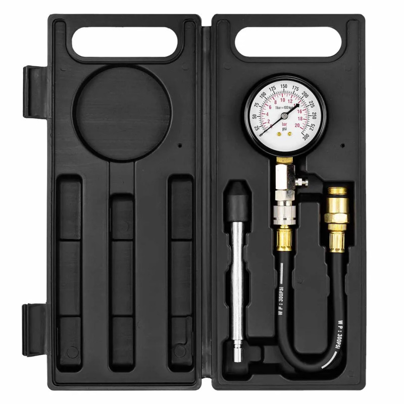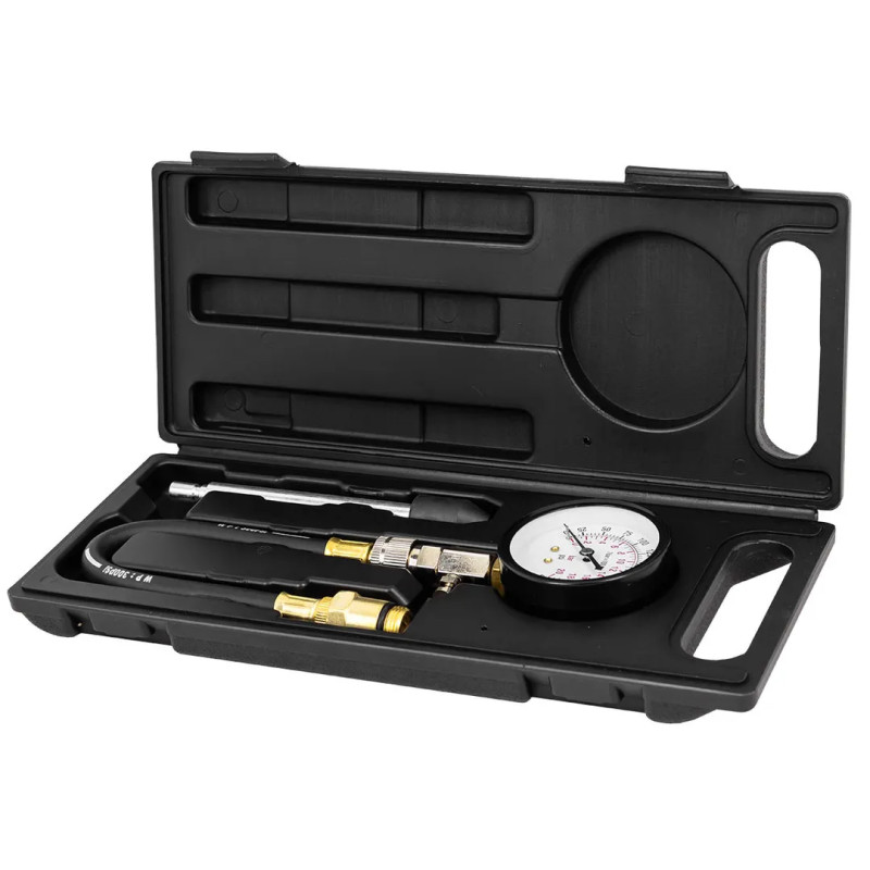 Набор с индикатором компрессии бензинового двигателя из 3 предметов, в кейсе - это прибор, который позволяет измерить давление в цилиндрах двигателя автомобиля.
