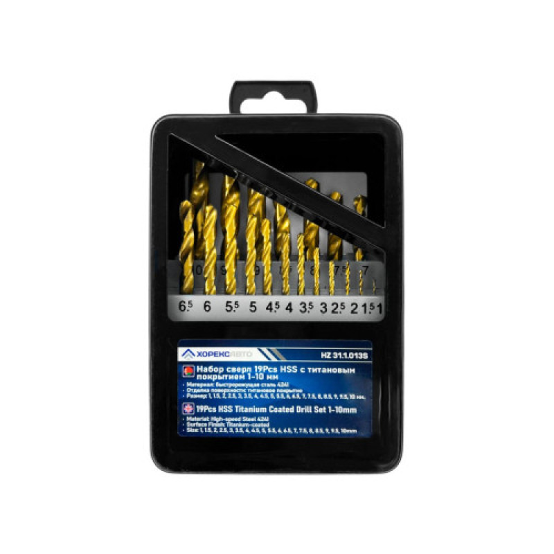 Набор приспособлений для изготовления отверстий Хорекс Авто HZ 31.1.013S включает 19 предметов, предназначенных для сверления отверстий с различными диаметрическими значениями: от 1 до 10 мм, с шагом в 0,5 мм.