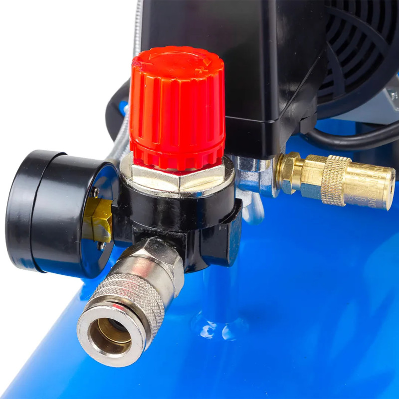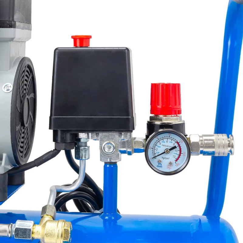 Домашний компрессор оснащен двухцилиндровым двигателем, а также манометром для регулировки давления.