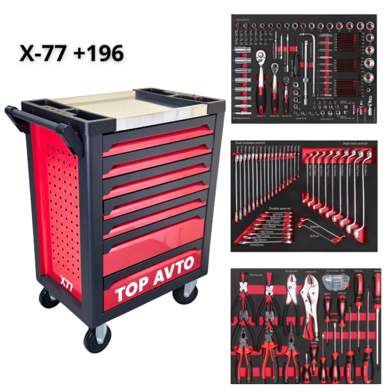 Представляем вашему вниманию надежную инструментальную тележку с набором из 196 инструментов, предназначенную для использования в автомастерских, автосервисах, гаражных условиях и домашних мастерских. Этот комплект включает всё необходимое для профессионального ремонта автомобилей, обслуживания техники и выполнения ремонтных работ любой сложности.