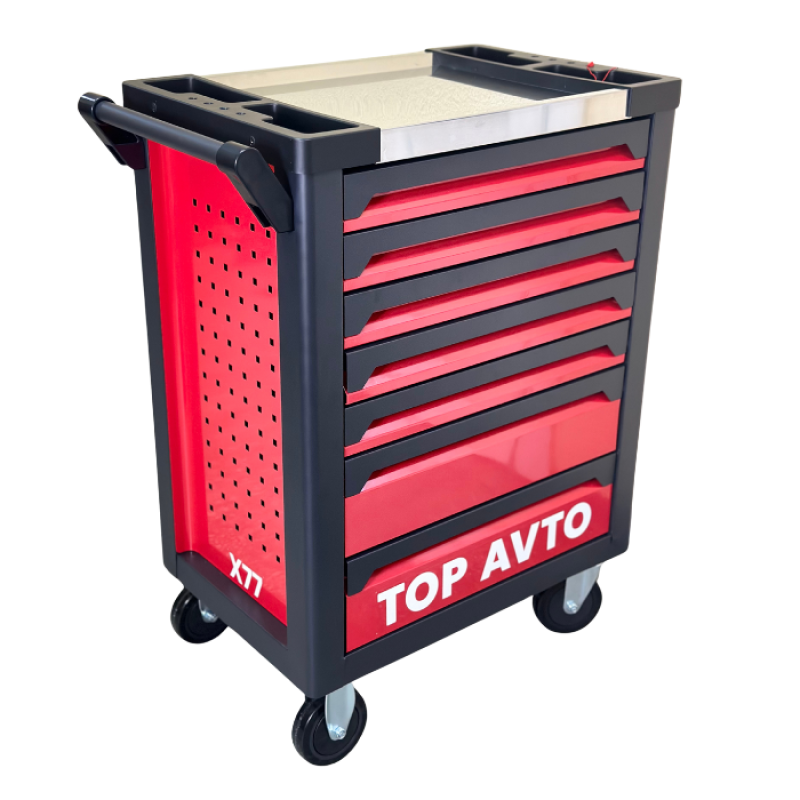 - Высокая мобильность — прочная металлическая тележка оборудована большими колесами, обеспечивающими легкое перемещение по мастерской или гаражу без лишних усилий.