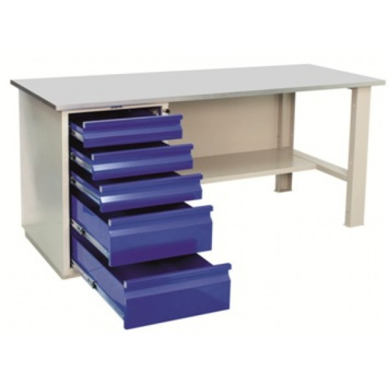 Габариты, мм: 1400x26x700Столешница: МДФ 24ммТумба: состоит из 5-ти выдвижных ящиков. Телескопические направляющие. Нагрузка на ящик 30 кг. Центральный ключевой замок Практик.Производитель: ЗАО Промет (Россия)Товар не подлежит обязательной сертификации.(!) Можно индивидуально смоделировать верстак, выбрав необходимые комплектующие и их расположение