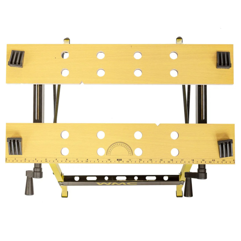 Верстак имеет две подвижные столешницы, которые двигаются по направляющим металлическим опорам.