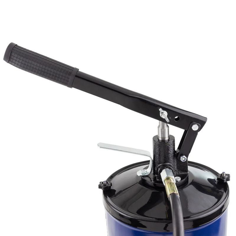 Оснащен ручным поршневым насосом и гибким шлангом высокого давления длиной 1,5 м с быстроразъемным соединением и стандартной смазочной головкой.