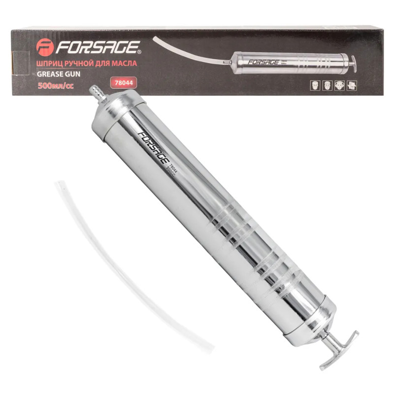 Шприц снабжен гибким шлангом с насадкой длиной 300мм, которая позволяет добраться до труднодоступных мест и избежать проливания масла.