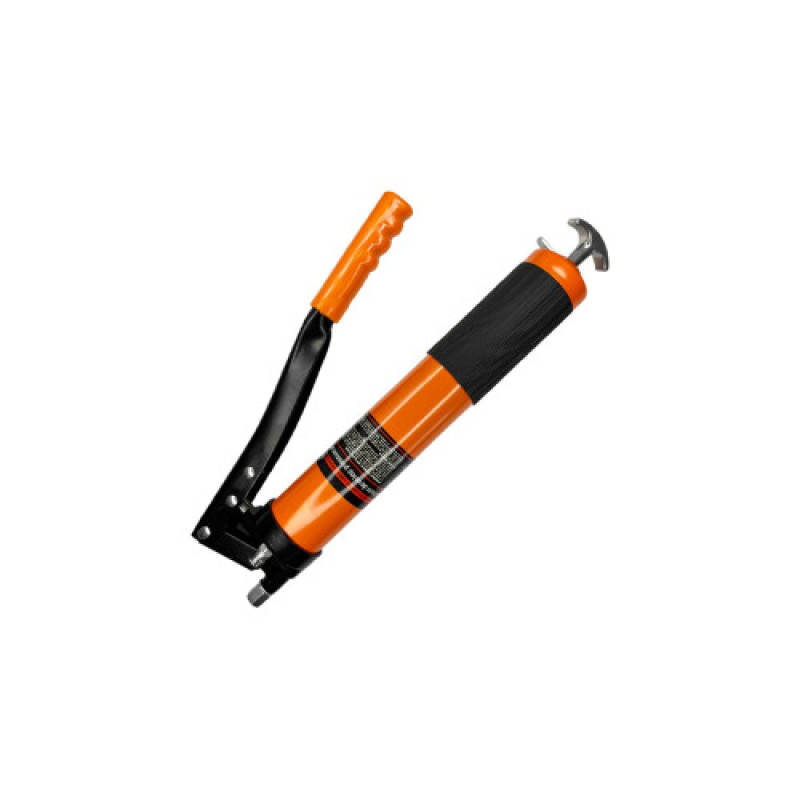 Корпус и цилиндр выполнены из высококачественного прочного алюминия, что гарантирует долговечность инструмента при интенсивной эксплуатации. Металлический рычаг позволяет легко и точно выдавливать смазку, обеспечивая равномерное распределение материала на нужных элементах.
