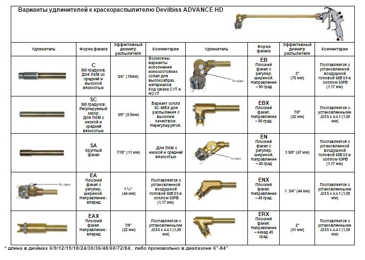 - Характеристики распыления,производительность,размер и форму факела можно, изменять заменой воздушной головы(см.таблицу),