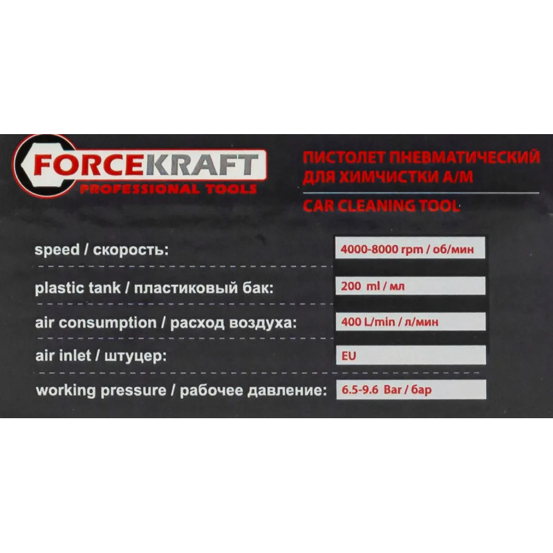 скорость 4000-8000 об/мин., бак 200 мл., расход воздуха 400 л./мин., воздухозаборник 1/4", рабочее давления 6.5 - 9.6 Бар.