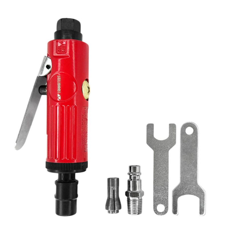 Универсальность обеспечивается комплектом цанг 1/4" и 1/8" что делает возможным использование различного вида насадок. Рабочее давление 6,2 бар и экономичное потребление воздуха 120 л/мин позволяют использовать машинку с большинством компрессоров