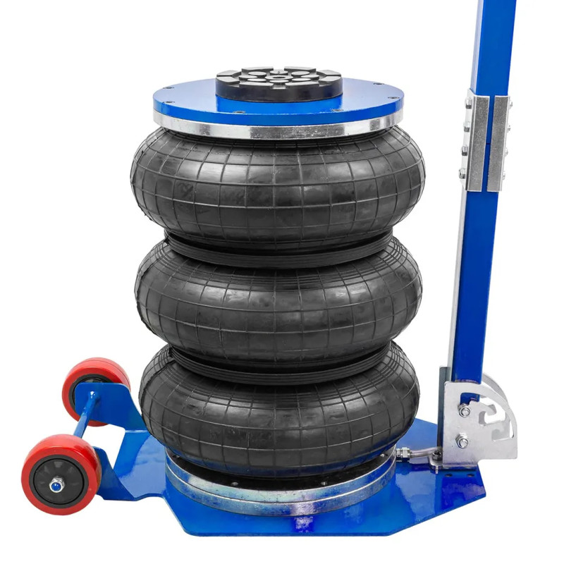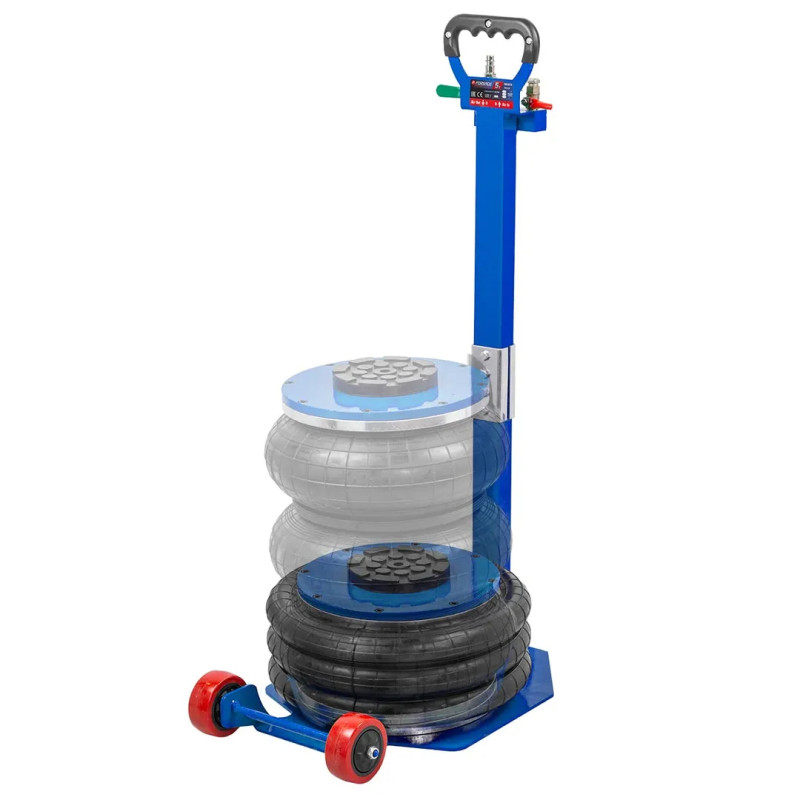 Профессиональный 3-камерный пневматический домкрат позволяет производить быстрый демонтаж и установку колес легковых автомобилей, а также необходимый местный ремонт подвески, узлов рулевого управления и тормозной системы.