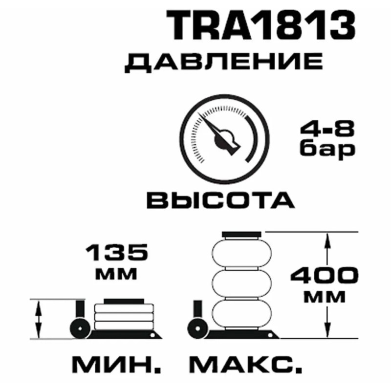 Конструкция данной модели включает три распорные резиновые подушки диаметром 300 мм, обеспечивающие максимальную высоту подъема объекта до 400 мм.