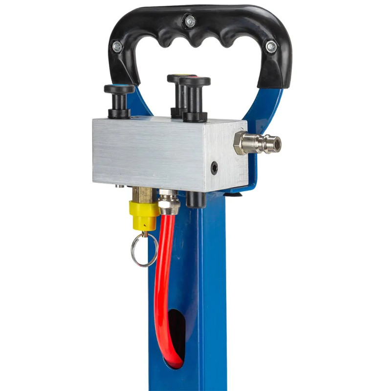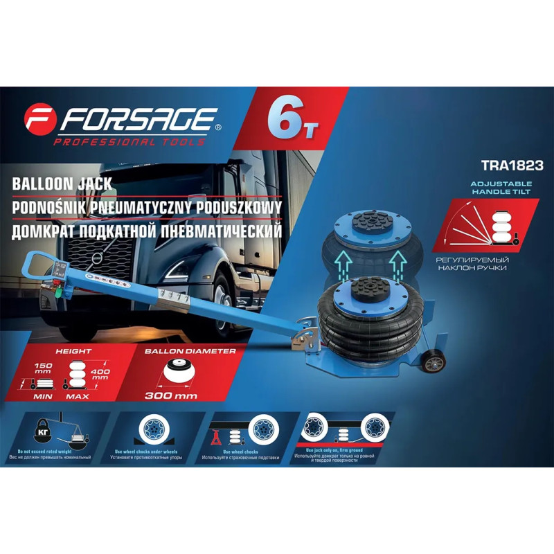 Домкрат подкатной пневматический имеет грузоподъемность 6 тонн и рассчитан на подключение к компрессору, подающему сжатый воздух под давлением от 6 до 12 бар.