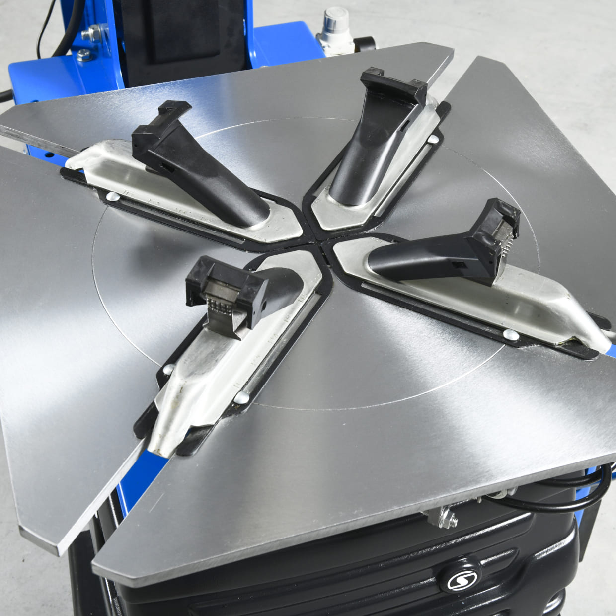 Четырехкулачковый механизм позволяет надежно зафиксировать колесо на рабочем столе. Кулачки оснащены пластиковыми накладками.